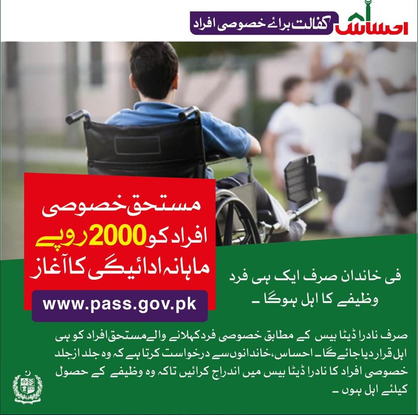 احساس کفالت برائے خصوصی افراد میں شامل ہونے کیلیئے معزور افراد مرد خواتین نادرا میں اپنا اندراج کروائیں اور شناختی کارڈ بنوایں اور قریبی احساس رجسٹریشن ڈیسک پرحاضرہوں۔