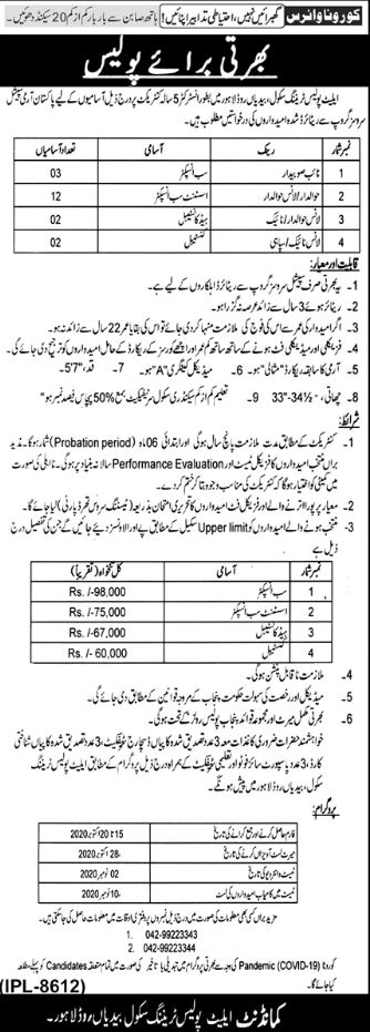 ایلیٹ پولیس ٹریننگ سکول لاہورمیں بطور انسپکٹر پانچ سالہ کنٹریکٹ پر آسامیوں کے لیے پاکستان آرمی اسپیشل سروسز گروپ سے ریٹائر شدہ امیدواروں کی درخواستیں مطلوب ہیں آسامیوں کی تعداد 19 ہے اس وقت چار مختلف کٹگری کی نوکریاں موجود ہیں نائب صوبیدار سب انسپکٹر حوالداراسٹنٹ سب انسپکٹر نائیک ہیڈ ۔کانسٹیبل سپاہی کانسٹیبل
