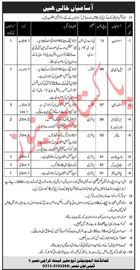 ایمونیشن ڈیو ملیر کینٹ کی طرف سے آٹھ مختلف کیٹگری کی نوکریوں کا اعلان کیا گیا ہے ٹوٹل نوکریوں کی تعداد 17 ہے