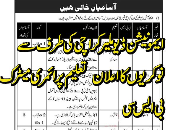 ایمونیشن ڈیو ملیر کینٹ کی طرف سے آٹھ مختلف کیٹگری کی نوکریوں کا اعلان کیا گیا ہے ٹوٹل نوکریوں کی تعداد 17 ہے
