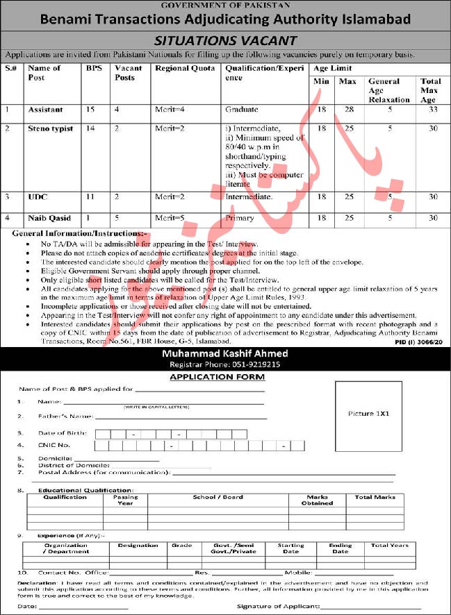 گورنمنٹ آف پاکستان بے نامی ٹرانژکشن اجیڈیکیشن اتھارٹی کی طرف سے نوکریوں کا اعلان