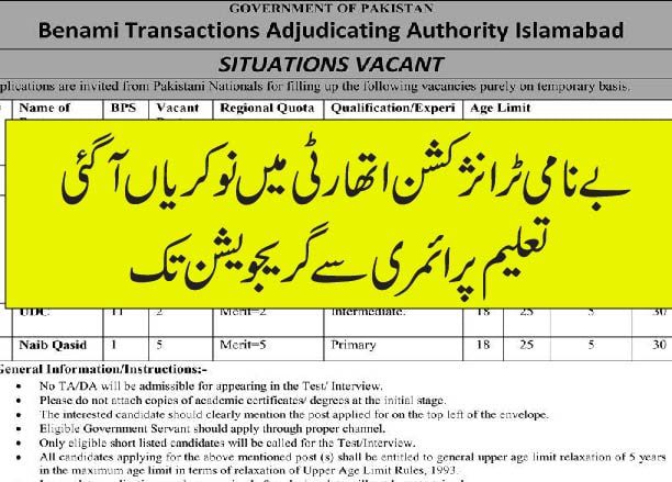 گورنمنٹ آف پاکستان بے نامی ٹرانژکشن اجیڈیکیشن اتھارٹی کی طرف سے نوکریوں کا اعلان