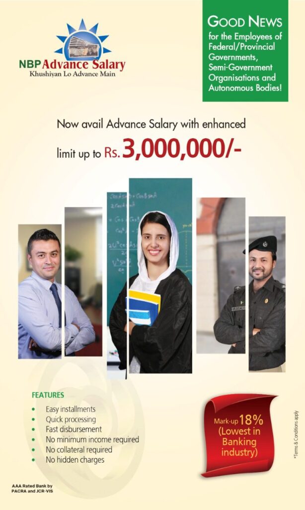 نیشنل بنک مختلف پروگرامز کے تحت قرضہ فراہم کرتا ہے جس پروگرام کے بارے میں ، میں آپ کو بتا رہا ہوں اس کا نام ہے ایڈوانس سیلری لون