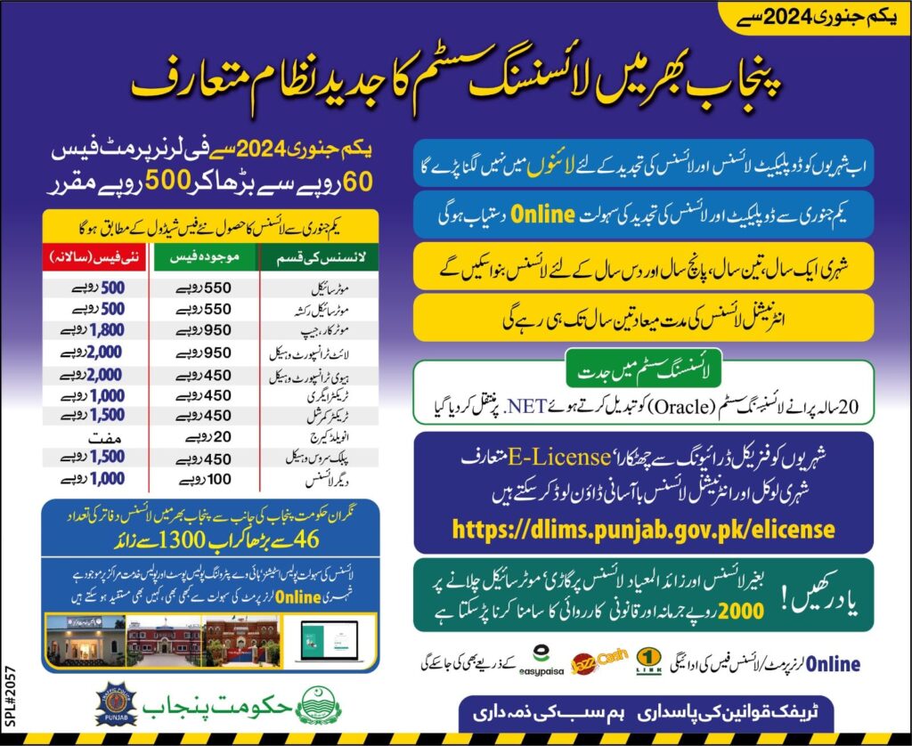 صوبہ پنجاب میں ڈرائیونگ لائسنس سے تعلق رکھنے والے تمام شہری اپنا لرنر ڈرائیونگ لائسنس آن لائن اپلائی کر سکتے ہیں اور ریگولر ڈرائونگ لائسنس کی آن لائن تجدید بھی کروائی جا سکتی ہے. ڈرائیونگ لائسنس کی فیس بذریعہ آن لائن جازکیش اور ایزی پیسہ سے ادا کر سکتے ہیں. نئے قانون کے مطابق بغیر ڈرائیونگ لائسنس کے موٹرسائکل یا گاڑی چلانے والے لوگوں کو دو ہزار روپے کا جرمانہ کیا جا سکتا ہے
