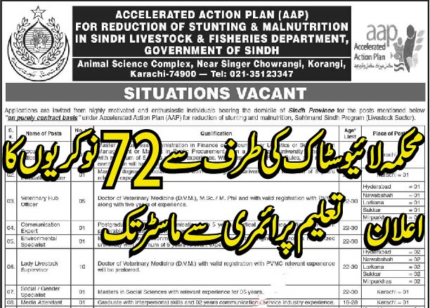 لائیوسٹاک ڈپارٹمنٹ سندھ کی طرف سے 72 نوکریوں کا اعلان کیا گیا ہے صوبہ سندھ کے رہائشی جن کے پاس ڈومیسل موجود ہے وہ ان نوکریوں کے لئے اپلائی کر سکتے ہیں