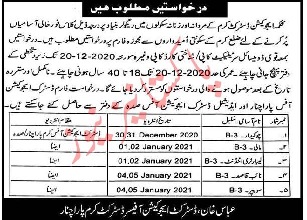 محکمہ ایجوکیشن ڈسٹرکٹ کرم کی طرف سے مردانہ اور ذنانہ سکولوں میں نوکریاں آ چکی ہیں