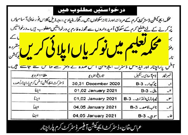 محکمہ ایجوکیشن ڈسٹرکٹ کرم کی طرف سے مردانہ اور ذنانہ سکولوں میں نوکریاں آ چکی ہیں