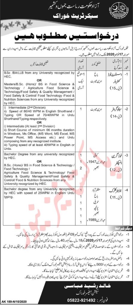 محکمہ خوراک آزاد کشمیر کی طرف سے مختلف کیٹگری کی نوکریوں کا اعلان کیا گیا ہے آزد کشمیر کے شہری