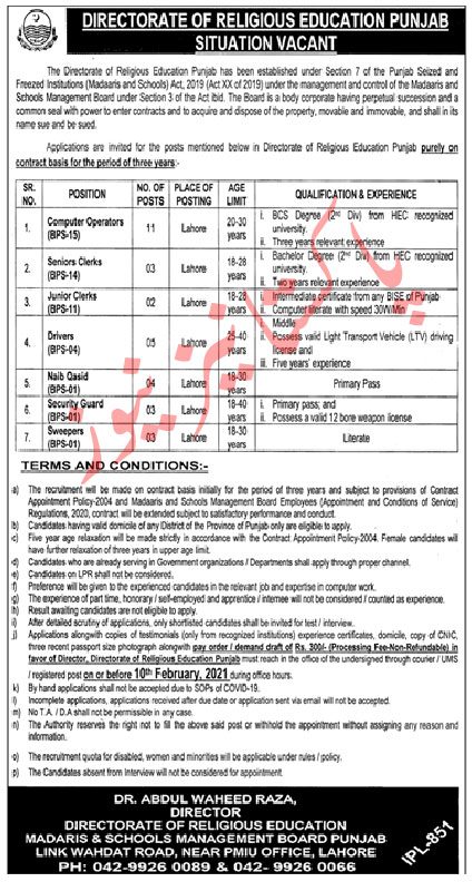 نظامت مذہبی تعلیم کی طرف سے سرکاری نوکریوں کا اعلان