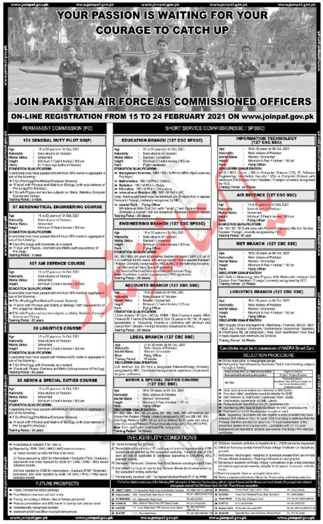 پاکستان ائرفورس میں کمشنر آفیسر کی مختلف ڈیپارٹمنٹ میں نوکریاں آ چکی ہیں ان نوکریوں کے لئے اپلائی کرنے کی آخری تاریخ 24 فروری 2021 ہے
