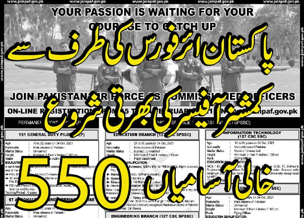 پاکستان ائرفورس میں کمشنر آفیسر کی بھرتی شروع خالی آسامیاں 550