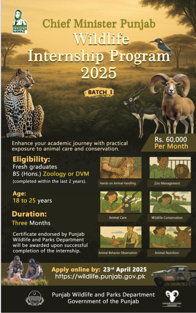 اگر آپ نے حال ہی میں زولوجی (BS Zoology) یا ڈاکٹر آف ویٹرنری میڈیسن (DVM) میں گریجویشن مکمل کی ہے اور جنگلی حیات سے محبت رکھتے ہیں تو چیف منسٹر پنجاب وائلڈ لائف انٹرن شپ پروگرام 2025 (Batch 1) آپ کے لیے ایک زبردست موقع ہے۔ یہ انٹرن شپ نہ صرف آپ کو جنگلی جانوروں کے ساتھ عملی تجربہ دے گی بلکہ آپ کو ماہانہ 60,000 روپے وظیفہ بھی دیا جائے گا۔
