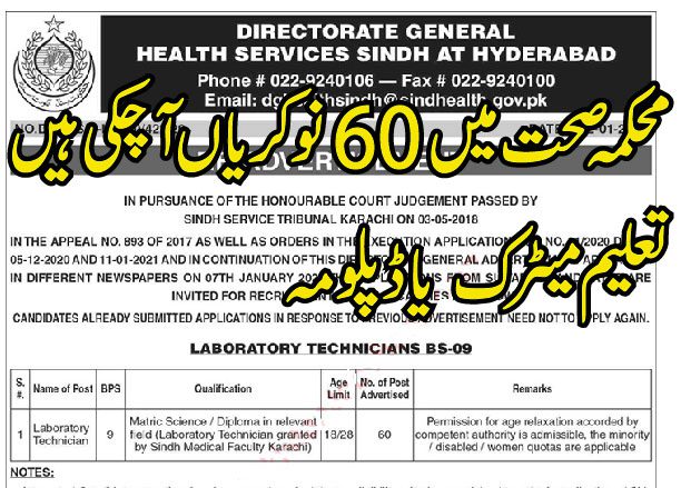 ڈریکٹر جنرل ہیلتھ سروس سندھ کی طرف سے نوکریاں آ گئی ہیں