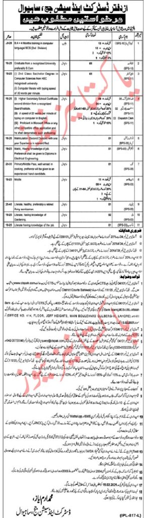 ڈسٹرکٹ اینڈ سیشن جج ساہیوال کی طرف سے 11 مختلف کیٹگری کی 42 نوکریوں کا اعلان