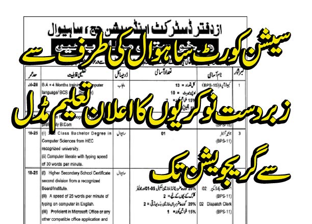 ڈسٹرکٹ اینڈ سیشن جج ساہیوال کی طرف سے 11 مختلف کیٹگری کی 42 نوکریوں کا اعلان