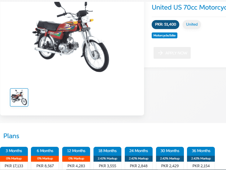 یو بی ایک بنک سے تین مہینے سے 36 مہینے کی ماہانہ قسطوں پر کسی بھی کمپنی کی موٹر سائکل مِل سکتی ہے