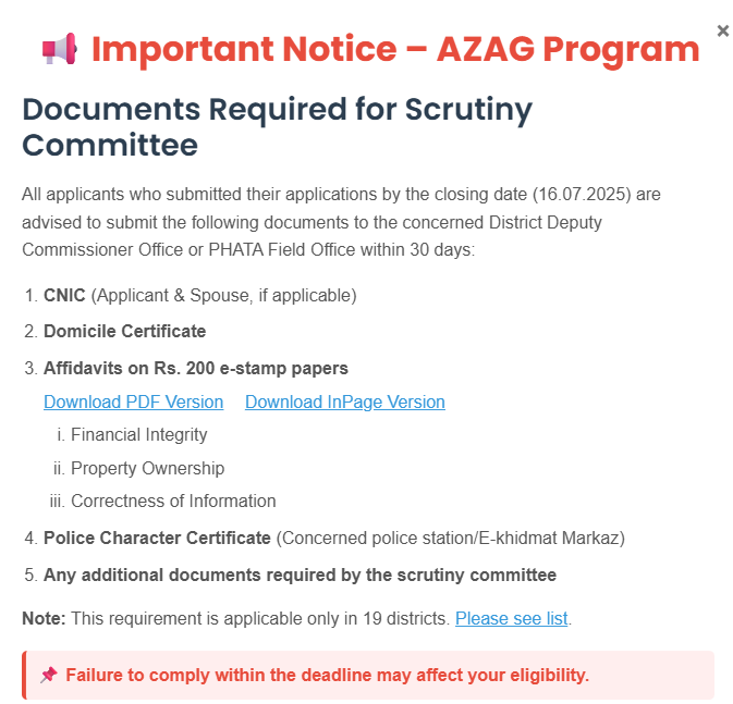 The flagship low-income housing scheme of the Punjab Government, Apni Zameen Apna Ghar (AZAG), has reached its next important phase: document verification and scrutiny. A notification released in July 2025 by the Housing, Urban Development, and Public Health Engineering Department has compelled shortlisted applicants to provide key documents within 30 days from the closing date (16 July 2025).