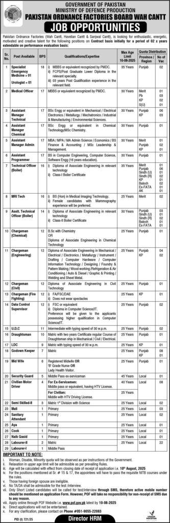 Pakistan Ordnance Factories Board (POF), functioning under the Ministry of Defence Production, Government of Pakistan, has released formally a large number of career opportunities. This drive for recruitment includes different technical, medical, and administrative positions on a contract basis for the initial period of 2 years, extendable on a performance basis.